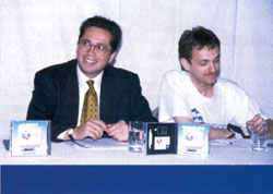 Презентацию проводили Андрей Колесников, руководитель отдела сетевых информационных систем "Совам Телепорта", Евгений Пескин, руководитель проекта "Россия-Он-Лайн" и Джефф Старк, директор отдела маркетинга и продаж этой же компании.