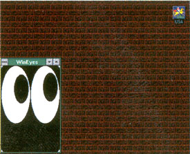2.02.1993. WINEYES. Sarmad Andan. Вон они, в углу экрана. Они следят за перемещением мыша по экрану, не моргая. Когда мышь ставится между ними, они сбегаются в кучку. Их можно свернуть в иконку, а можно распахнуть на весь экран – машина все равно будет строить вам глазки. Что ж, подумал я, интересно, свежо, оригинально. Как пироги с глазами: "их едят, а они глядят". Читаю описание – и что? Программа, видите ли, "inspired", – и чем бы вы думали? Вполне "досовским" предшественником. И грустно, и смешно. На этом отступление от анти-windows'ской традиции провалилось. Вернемся же от этой трагикомедии к старому доброму DOS'y. Вы, случаем, не арканоик?