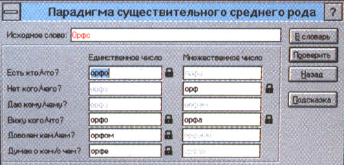 Есть разница и в способе включения в словарь неизвестного слова со словоформами. И тут, и там вам, так сказать, ассистируют, автоматически подсовывая гипотезы, уже первая из которых чаще всего оказываются верной, в случае же, если автоматической настройки на гипотезу не получилось, "Орфо" подсовывает вам довольно длинный вопросник, "Пропись" же, во-первых, предлагает гораздо больше гипотез (это, с одной стороны, практически исчерпывает все возможные варианты словоформ, с другой же – пугает порою58 длиною списка), во-вторых -систему "замочков", при которой вы вводите одну-две60 формы слова вручную и запираете их на замок: подбор вариантов происходит при неизменности введенных вами форм и, как правило, заканчивается61 полной удачей. Лично автору второй способ представляется более изящным, но дело это, кажется, вкусовое.
