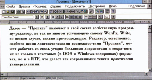 Далее – "Пропись" включает в свой состав собственную74 программу-редактор75, не так во многом уступающую самому Word'y, Write, во всяком случае, сильно превосходящую. Редактор, естественно, снабжен всеми лингвистическими возможностями "Прописи", может работать со сколь угодно большими документами и сохранять их не только в текстовых (в DOS и Windows-кодировках76) форматах, но и в RTF, что делает так сохраненные тексты практически универсальными.