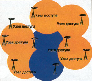Из рисунка видно, что каждый участок территории города лежит в зоне действия как минимум двух-трех сот. Связано это с тем, что при выходе из строя какой-либо из точек доступа информация пользователя сохранится в соседней соте: архитектура сети предполагает, что все точки доступа имеют информацию о соседних с ними точках и зарегистрированных в них пользователях. Такая организация обеспечивает практически стопроцентную защиту от сбоев.