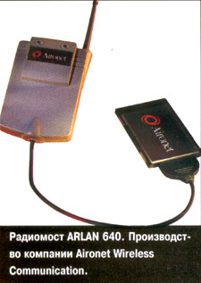 Для построения "сотовой Internet" наиболее подходит радиомост ARLAN 640, внешний вид которого представлен на рисунке. Основу этого устройства составляет микросхема производства компании Aironet, в функции которой входит прямое и обратное преобразование информации в шумоподобные сигналы, а также организация режима "roaming". По вопросам поставки, установки и подключения SST-устройств, а также обучения работе в сетях Internet, Spint, CompuServe и др. вы можете обратиться в фирму OLTOCOMM по телефонам: (095) 926-01-31; (095) 926-05-88.
