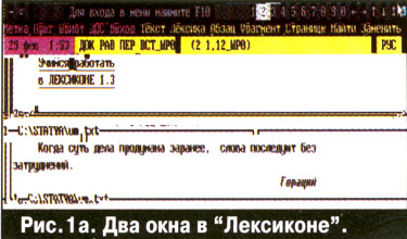 Итак, в "Лексиконе" первое окно уже занято нужным нам документом. Перейдем во второе, нажав {ALT-2}, для набора текста нового будущего файла Комбинация клавиш {AU-номер окна) осуществляет переход в окно по его номеру.