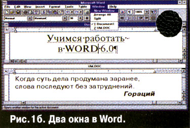 Для того чтобы увидеть одновременно два окна, как показано на рис 1, Word предлагает удобную команду: Окно, Упорядочить (Window. Arrange All). Вручную изменить размер и местоположение окна позволяет системное меню Клавиши {ALT-пробел} вызывают это меню для управления окном программы, а (ALT-дефис) – для окна документа.