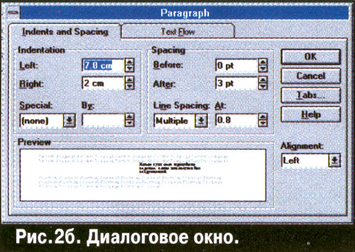 Легко просматривается соответствие между характеристиками схемы рис. 2а и диалогового окна команды Формат. Абзац (Format, Paragraph), вкладка ОТСТУПЫ и Интервалы (Indents and Spacing) на рис. 26.