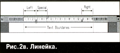 В Word некоторые характеристики шрифта (гарнитура, кегль, начертание) и абзаца (вид выравнивания) отражаются на стандартной панели Форматирование (Formatting). Границы абзаца очень хорошо видны на Линейке (Ruler) – рис.2в. Абсолютно все параметры формата выделенных символов и абзацев перечислены в соответствующих диалоговых окнах.