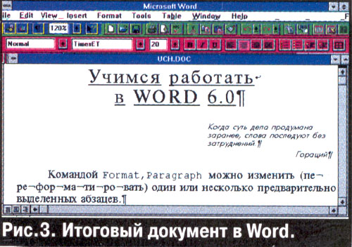 Продолжаем параллельную работу в среде текстовых процессоров "Лексикон" 1.3 и WinWord 6.0. Надо создать документ, экранный вид которого представлен на рис.3. Помимо знакомства с Word, желающих попутно поучим "Лексикону".