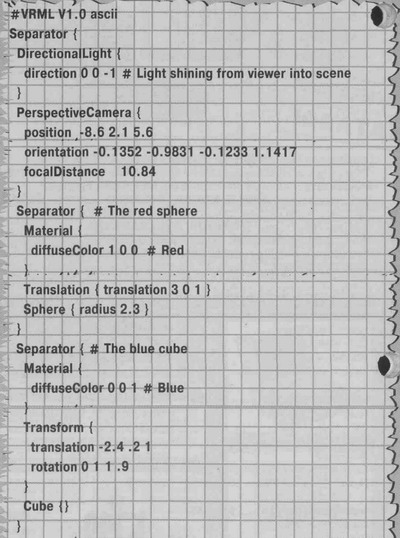 Так выглядит описание на VRML простейшей картинки – красный конус и голубой шар в лучах направленного света: