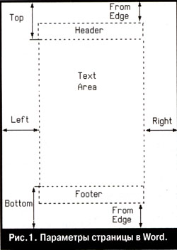 При работе с документом всегда имеется основная область вывода текста (Text Area), называемая полосой набора (рис. 1). Значения полей страницы, которые определяют размер этой области, устанавливаются в диалоговом окне Файл. Параметры страницы (File, Page Setup) на вкладке Поля (Margins): Верхнее (Ход), Нижнее (Bottom). Левое (Left) и Правое (Right).