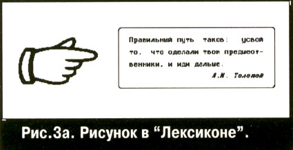 В "Лексиконе"вставка картинки, причем только черно-белой, организована с помощью управляющей строки и идентификатора рисунка. При этом рисунок и текст располагаются на странице независимо друг от друга. Возможно и масштабирование рисунка. Рядом с рисунком (рис.За) напечатан текст в рамке со скругленными углами. Внутри картинки с рукой тоже мог бы находиться текст, например, слово "рука". Для того чтобы точно "попасть в цель", надо почаще обращаться к режиму имитации печати.