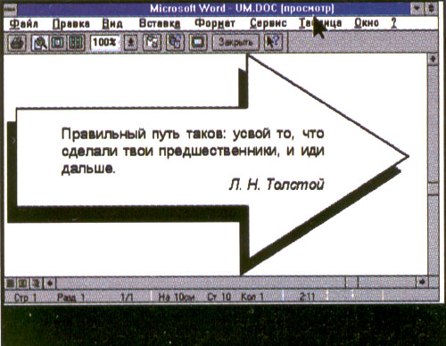 В документ Word вставлен рисунок – большая стрелка, смотрите на рис.36. Что-то приписать сбоку от картинки или сделать на ней надпись обычным вводом текста нельзя. Можно менять размер рисунка командой Формат. РИСУНОК (Format. Picture), предварительно выделив его до появления черных квадратиков на границах рисунка. Добиться того, чтобы текст "обтекал" рисунок, можно, только поместив последний в кадр с помощью команды Вставка, Кадр (Insert. Frame).