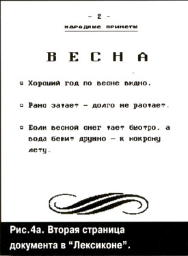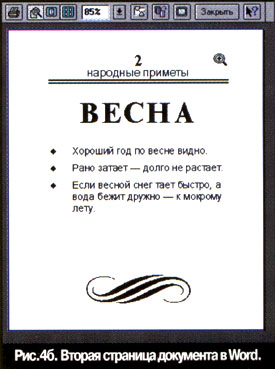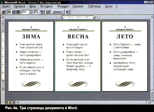 Рассмотрим другой пример для знакомства с документом, занимающим несколько страниц(рис.4). Текст содержит приметы для каждого сезона года. Пословицы образуют так называемый список, перечень, бюллетень. Обычно список украшают жирной точкой, ромбиком, квадратиком, т.е. символом списка, стоящим слева от основного текста.