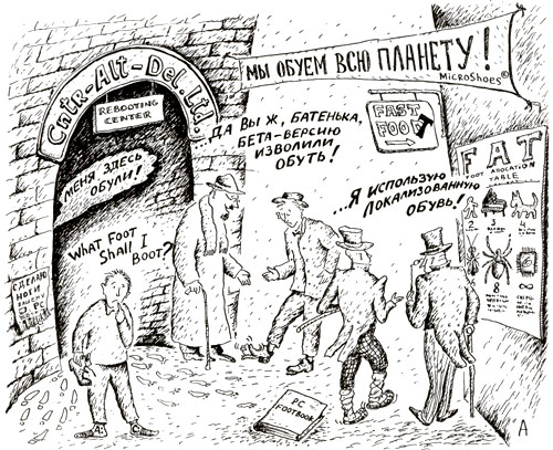 3. Для компьютера с длиной ноги менее 8 МБ (МБ – условная единица длины ноги) лучше использовать маломягкие ботинки (серии ДОС, Окна). В противном случае лучше использовать ботинки фирмы "Международные Деловые Машины" (серии ОС/2). Всегда имейте в виду: чем длиннее ноги, тем быстрее ваш компьютер будет бегать.