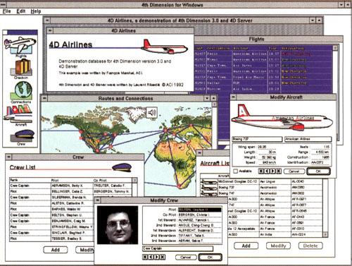 Следующим представителем является 4Dimension – профессиональный инструмент разработки приложений в архитектуре "клиент-сервер". Мощными средствами программирования здесь являются объектно-ориентированный графический редактор и язык высокого уровня, имеющий конструкции if, case, for, while, repeat и обеспечивающий работу с локальными и глобальными переменными, функциями, объектами и процедурами 4Dimension поддерживает независимую от операционной системы многозадачную обработку данных. В этом режиме каждое окно активно, независимо, и при внесении изменений в одном окне данные в других окнах модифицируются автоматически. Открытая архитектура 4Dimension позволяет соединять базу данных с большим количеством внешних устройств.