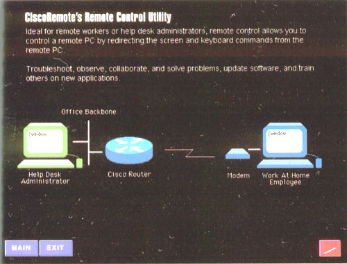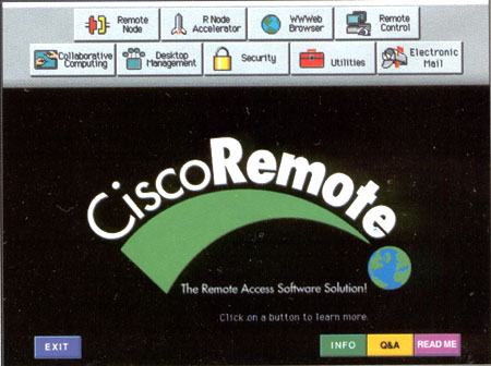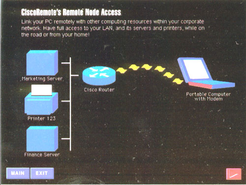 Там были еще интересные экспонаты в этом роде, но боюсь, немецкий юмор у нас мало кто оценит. Зато демонстрационная дискета пакета CiscoRemote, которую "киска" раскидывала там ящиками, наверняка понравится всем. Она показывает, что такое в современном представлении работа на дому. На рисунке вы видите структуру пакета. Со своей домашней PC, из-под Windows или Windows 95, через телефонную линию и модем вы подключаетесь к офису компании Jp# провайдеру "Интернета" – по протоколу SLIP/PPP, и, конечно же, проходите через любимый маршрутизатор от "киски". Таким порядком вы получаете доступ ко всем своим корпоративным серверам и их услугам.