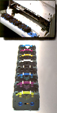 Краска переносится с ленты, уложенной в самые обычные на вид маленькие кассеты. В принтер можно установить до четырех кассет стандартно это три цветных (CMY) и черная. Металлические можно носить отдельно в кармане. Представители фирмы не раскрывают технологии переноса краски, называя этот процесс туманным словосочетанием Micro Dry. Но сопоставляя толщину четырехслойной ленты (3 микрона), тип связующего вещества краски (смола) и технологию производства головки (осаждение на кремнии), можно предположить, что это все-таки термоперенос.
