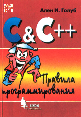 Книга А.И.Голуба (который вовсе не Александр Ильич, а некто Ален И., американец), то есть вариант "Бинома", написана в сугубо американском стиле с шуточками, прибауточками и воспоминаниями о прошлом. Это не учебник в "советском" понимании, а нечто, больше всего похожее на издания типа" 100 способов заработать деньги", "999 принципов процветания", "77 инструкций для менеджера" и так далее. Здесь приводится 161 правило программирования на Си и Си++. Откровенно говоря, я могу сказать следующее: издательство "Бином" в очередной раз продемонстрировало нам новый жанр. Дело в том, что большая часть советов г-на Голуба применима при программировании практически на любом языке "невизуального" типа, и акцент автора в сторону Си, по-моему, просто скромная уступка рекламе (книгу на абстрактные темы никто покупать не будет). Так что у всех "вольных борзописцев" (пользуясь термином некоего Соколова – борзописца, видимо, невольного)есть шанс написать книги на темы "Правила программирования на языке XYZ" (название подставьте сами).