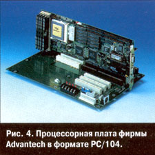 Предложенная фирмой Ampro шина РС/104 получила широкое распространение взамен iSBX в качестве мезонинной шины для одноплатных компьютеров. В то же время ряд фирм выпускает и процессорные платы, имеющие стандартный для РС/104 размер 90x96 мм. На рис. 4 представлен процессорный модуль фирмы Advantech, объединяющий на небольшой плате все функции материнской платы IBM PC/386, 4 Мбайт ОЗУ, электронный диск емкостью до 1 Мбайт, а также последовательный и параллельный порты.
