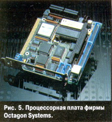 На рис. 5 показана процессорная плата фирмы Octagon Systems, включающая все функции материнской платы IBM PC/386,4 Мбайт ОЗУ, два электронных диска общей емкостью до 1,5 Мбайт, два последовательных и один двунаправленный параллельный порт, контроллер НГМД и НЖМД, а также программатор флэш-памяти. На одном из электронных дисков предварительно установлена DOS v6. Она универсальна и может использоваться как в системах с пассивной системной шиной, так и в качестве одноплатного компьютера с возможностью расширения через мезонинную шину РС/104.