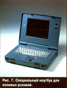 Отдельного разговора заслуживают специальные защищенные и упрочненные компьютеры для мобильных пользователей. В частности, на рис. 7 можно видеть портативный компьютер фирмы Getac, который одинаково надежен в условиях как пыльной бури, так и морского шторма Несмотря на внешнее сходство с обыкновенным ноутбуком, его конструкция имеет ряд уникальных особенностей- пылевлагонепроницаемый металлический корпус, вибростойкость и ударопрочность в соответствии с военными стандартами, широкий диапазон рабочих температур (-20...+50 °С) и т.п. Такие защищенные ноутбуки находят применение в военной и промышленной сфере, например, для обслуживания автоматических станций, передвижных диагностических лабораторий и т.д.