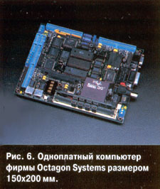 На рис. 6 показан одноплатный компьютер фирмы Octagon Systems размером 150x200 мм: вычислительная мощность до 486DX4-100; объем ОЗУ до 32 Мбайт, три электронных диска общей емкостью до 2,5 Мбайт; четыре последовательных порта RS-232/485, параллельный порт принтера, порт клавиатуры, программатор флэш-памяти; IDE-контроллер гибких и жестких дисков; к локальной шине с быстродействием 33 МГц подключены интерфейсы SCSI, Ethernet и SVGA (1 Мбайт) с поддержкой как ЭЛТ-дисплеев, так и плоских панелей, а также шина расширения РС/104.