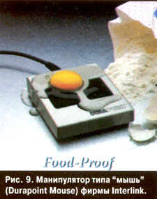 Тем не менее обычные клавиатуры тоже используются и довольно широко. Для обеспечения их пылебрызгозащиты применяются накладки из прозрачного пластика, наклеиваемые поверх клавиш, а также мембранная технология (рис. 3). Существуют клавиатуры и для работы в агрессивных средах – для них не страшны брызги нефтепродуктов, их можно мыть водой с порошком. С такой же степенью защиты выпускаются манипуляторы типа "мышь" (Durapoint Mouse), не содержащие движущихся частей (рис. 9).