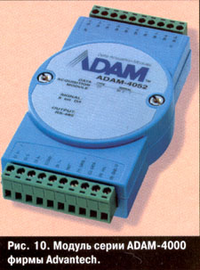 Специфичными для промышленных применений являются аппаратные средства, предназначенные для непосредственной связи вычислительной системы и объекта управления. Эти средства ответственны за нормирование и/ или линеаризацию входных сигналов с датчиков или усиление выходных сигналов для исполнительных устройств. При этом весьма часто предъявляются требования полной гальванической развязки вычислительной системы от каждого из входных или выходных каналов, а также между самими каналами. Ряд фирм, таких как Analog Devices, Grayhill, Opto22, выпускает специальные модули (Data Acquisition Modules), реализующие эти требования. В последнее время получают распространение удаленные модули, имеющие непосредственный выход на одну из шин класса Fieldbus, что позволяет легко интегрировать датчики и исполнительные устройства в распределенных системах управления. Типичным примером могут служить модули серии ADAM-4000, выпускаемые фирмой Advantech (рис. 10).