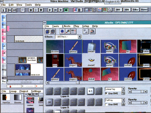 Помимо базовых спецэффектов "Алладин" позволяет пользователю создавать свои, которыми затем можно дополнить основную библиотеку. В используемом для этой цели редакторе эффектов есть специальная временная дорожка: эффект разбивается на ключевые точки (keyframes), по которым устанавливается продолжительность действий с изображением. Можно применять все вышеперечисленное из инструментария "Алладина", наслаивать эффекты друг на друга, включать титры и картинки и т.д. "Алладин" предлагает и такую интересную возможность, как "прокеивание": получив изображение объекта на однотонном фоне, можно затем заменить фон на "картинку" или видео и "вживить" персонажа в любой пейзаж, настроив эффект с точностью до пикселя . Занятие необычайно интересное и увлекательное, хотя очевидно, что создание хорошего эффекта – достаточно продолжительная и кропотливая работа, требующая развитого вкуса и немалой профессиональной подготовки в области кино и видео.