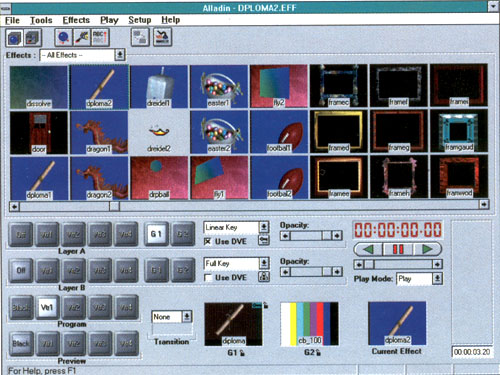 Alladin Media Printer является многофункциональной производственной системой обработки видеосигналов, включающей несколько мощных видео- и графических приложений. Фактически это настольная студия, использующая полное 4:2:2:4-видео и соответствующая стандартам CCIR 601, которая может функционировать и как отдельная система, и как элемент сложного монтажного комплекса. "Алладин" выгодно отличает и открытость архитектуры: система позволяет расширять базовый набор инструментов и функций другими приложениями.