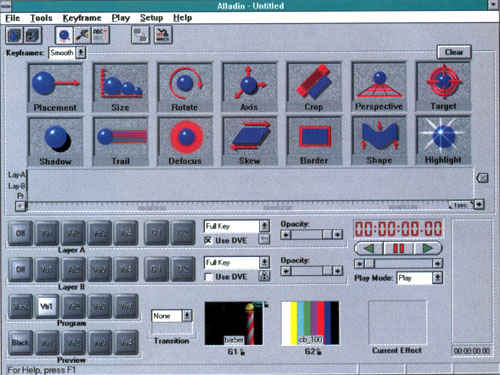 И напоследок об интеграции с VideoMachme. Специальная плата "забирает" сигнал с выходов Digital Player Recorder (DPR; он выдает поток в собственном цифровом формате, одним потоком, в то время как "Алладину" могут понадобиться два или три) Video-Machine и выводит двумя отдельными аналоговыми потоками стандартных компонентов. В связке VideoMachine-Alladin отчетливо проявляются все преимущества VideoMachme как системы линейного и нелинейного монтажа и "Алладина" – процессора видеоэффектов. Например, после подключения двух воспроизводящих и одного записывающего устройств остается определить только точки получения видео, основу для помещения эффекта и собственно сам используемый эффект. Результат – готовая студия линейного монтажа.