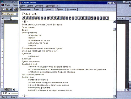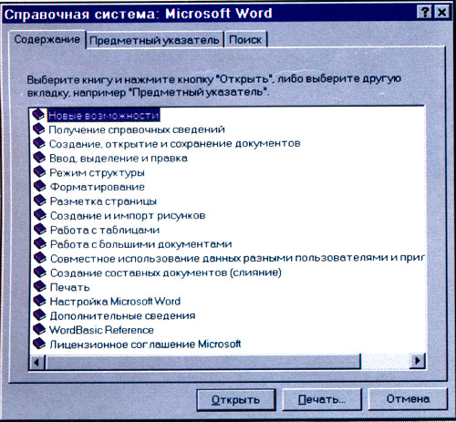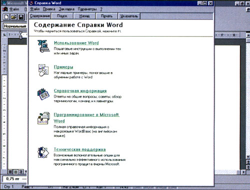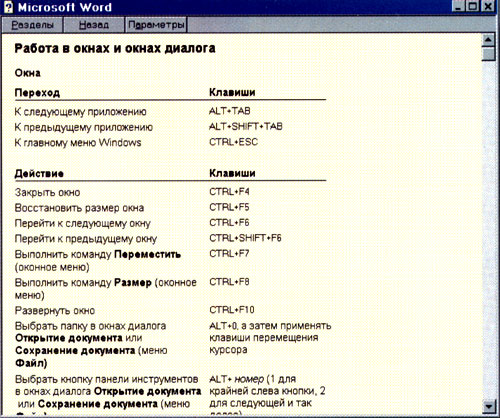 Я пользуюсь Windows 95, редактором Word, и у меня на экране после нажатия F1 появляется приведенная ниже таблица.