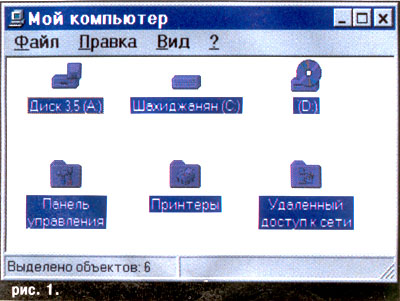 Если у вас установлена Windows 95, то на компьютере есть иконка "Мой компьютер"(название условное, ибо вы сами, как захотите, так и можете называть свой компьютер). Дважды щелкните левой кнопкой мыши эту иконку, и у вас появится окно "Мой компьютер" (см. рис. 1).