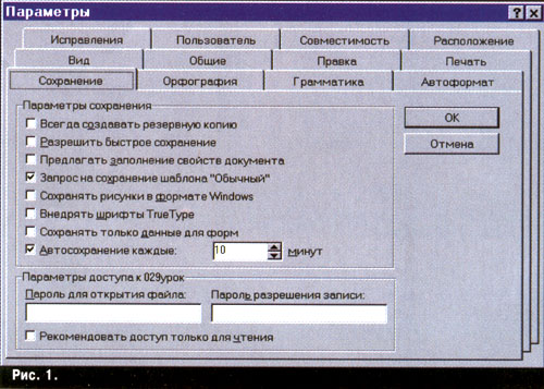 В настройках есть "поля ввода". Пример "поля ввода" можно посмотреть на рис. 1: после текста Автосохранение каждые я поставил число 10. (В этом поле можно набрать любое число минут.) Над каким бы документом я ни работал, он будет автоматически сохраняться (записываться на диск) через каждые десять минут.