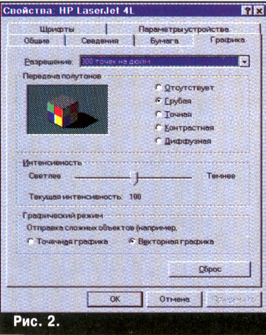 Иногда рядом с параметрами нарисованы не квадратики, а кружочки. Например, на рис.2 в группе "передача полутонов" перечислены пять способов печати картинок на принтере. Выбрать можно только один.
