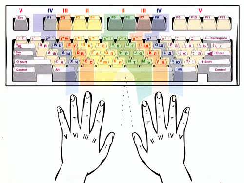 Правая рука печатает буквы нижнего ряда: т, ь, б, ю, ё. Если произнести слово ТЬБЮЁ, то оно напоминает какое-то французское слово, но сколько мы ни просили найти во французском языке перевод этого слова, никто не мог помочь. Многие говорили: "Действительно, французское, но что оно означает?.." Предположим, что во французском языке все-таки такое слово есть, и означает оно "бью до победного". А может быть, легче запомнить ТЬБЮЁ, использовав аббревиатуру: Тут Мягкий знак Бродил Южнее Ёлки.