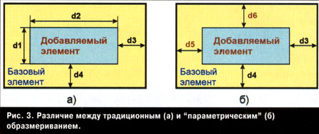 В традиционных CAD/CAM-системах пользователь обязан сначала образмерить элемент конструкции (его собственную геометрию), а затем определить его местоположение на 30-модели, задав дополнительные размеры (рис. За). В Pro/ENGINEER использован иной подход, когда каждый вновь добавляемый элемент определяется геометрическими параметрами по отношению к уже существующей детали (рис. 3б). Таким образом, инженер может с легкостью оценить различные варианты конструкции, просто изменяя параметрические размеры объекта, когда геометрия становится "производной" от значения размеров и автоматически меняется при их изменении. А полная ассоциативность инженерных дисциплин обеспечивает прохождение всех изменений через всю цепочку цикла: 2D-чертеж–твердотельная модель–траектория резания–технологическая оснастка.