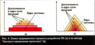 Фирма РТС выбрала иной путь, который назвала методом "быстрого применения прототипа", позволяющий сократить до минимума сроки внесения необходимых поправок в создаваемую систему. Заказчики в своих технических заданиях определяют весь спектр функциональных возможностей будущих систем, но на первом этапе разработки системы задают лишь основные характеристики и функции необходимого им ПО. И только эти основные, критичные для заказчика функции реализуются в компактном ядре системы, которое предоставляется пользователю как прототип будущего продукта (рис. 4б). В силу малого первоначального объема ядра оно может быть быстро изменено в соответствии с пожеланиями пользователей. Затем система наращивается путем интеграции в разработанное ядро дополнительных функций и характеристик. После чего РТС рассылает своим крупным заказчикам подготовленный продукт для бета-тестирования, в процессе которого выполняются наиболее значительные доработки и изменения, и лишь затем продукт выходит на рынок. Такой метод "быстрого применения прототипа" и постоянного "завертывания" во все новые слои ядра системы обеспечивает на выходе функционально полный продукт, отвечающий конкретным производственным задачам. Пользователи же получают самые ранние экземпляры системы, в которой они нуждаются.