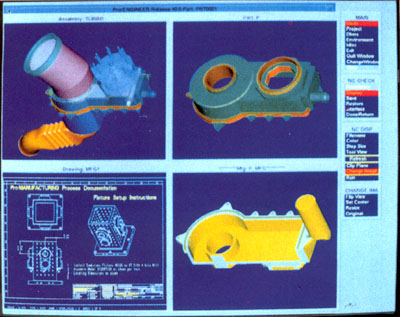 Положительной стороной такого подхода явилось и то, что все модули Pro/ENGINEER, которые используются на разных стадиях проекта (концептуальное проектирование, прочностный, термический, кинематический и динамический анализ, разработка конструкторской документации, технологическая подготовка производства и генерация программ для станков с ЧПУ), интегрированы на основе использования единой структуры данных, содержащей собственно данные об объекте, информацию об условиях его создания и взаимодействии с другими объектами, его геометрические и негеометрические свойства, параметрические размеры, информацию о взаиморасположении соседних объектов и другие конструкторско-технологические данные.