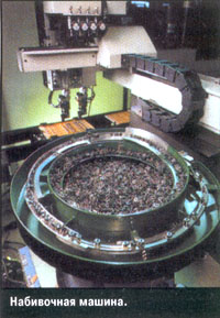 Вначале стоят комплектовочные станки. Они заряжены множеством бумажных лент с компонентами -например, резисторами разных номиналов, и собирают их на другую ленту, где компоненты расположены в порядке установки. Набивочный станок заглатывает эту ленту и со скоростью швейной машинки всаживает компоненты в дырки на плате, успевая обкусывать выводы и подгибать концы. Удивительная штука.