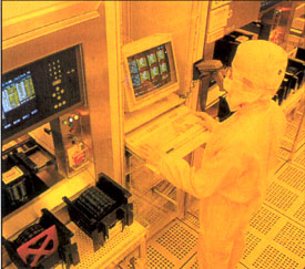 На показывали цех, где делают 16-мегабит-ные микросхемы динамической памяти на восьмидюймовых "вафлях" . У них есть еще старое производство(4 мегабита). Вторая очередь начнет с 16 мегабит и будет осваивать 64. Когда я в последний раз знакомился с таким производством, микросхемы были на 16 килобит, а "вафли", кажется, сантиметров по шесть в диаметре. Помнится, тогда переходили от оптической литографии к электронной. В последнее время пишут, что пора бы осваивать синхротронное излучение.
