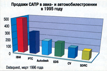 Все это позволило существенно повысить функциональность системы и расширить спектр решаемых с ее помощью задач проектирования и производства. Сразу же начал расти и объем продаж системы – по данным IDC, к середине 1996 года доля системы составила 13% мирового рынка, а по данным Dataquest (март 1996 года) система CATIA функционировала на 45% рабочих мест проектирования в мировом автомобилестроении и около 70% – в авиастроении.