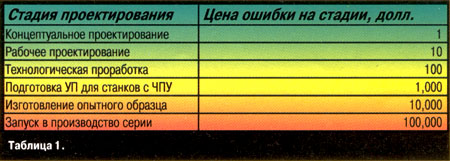 В качестве ответа на подобные высказывания можно привести результаты проведенного на Горьковском автозаводе эксперимента: при изготовлении опытного образца джипа "Атаман* с самого начала проектирования было условлено проводить 75% работ с использованием CATIA и 25% обычным способом, "на кульмане". В результате все, что было спроектировано на CATIA, пришло на сборку без ошибок и не потребовало доработок "по месту". В остальных случаях потребовалась масса переделок, изменения конструкции и т.д. в результате ошибок проектирования. Понятно, что чем позднее ошибка выявлена, тем дороже ее исправление. Об этом красноречиво свидетельствуют подсчитанные экспертами автомобильной компании General Motors оценки того, во что обходится исправление ошибки в конструкции одной лишь детали, приведенные в таблице 1. В дорогостоящих проектах цена одной ошибки близка к стоимости 2-3 рабочих мест системы CATIA, которая позволяет их избежать.