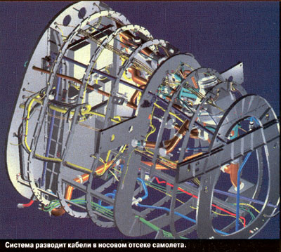 Аналогичными возможностями обладает модуль "Проектирование и изготовление электросистем", где к геометрическому описанию жгутов добавляется функциональная специфика: легко определить (в дополнительном плоском окне)раскладку проводов в жгуте, проходящем через крепление к корпусу; создать ответвление со специальной изоляцией в месте выхода группы проводов из жгута; создать прокладку жгута вдоль конструктивного элемента (например, обшивки). Система имитирует физическое провисание жгута и позволяет управлять параметрами провисания. Так же легко получить чертеж раскладки жгута с указанием всех атрибутов: точной длины, сечения, типа изоляции и т.п.