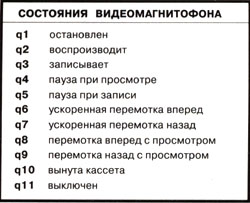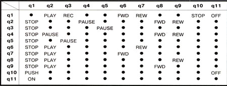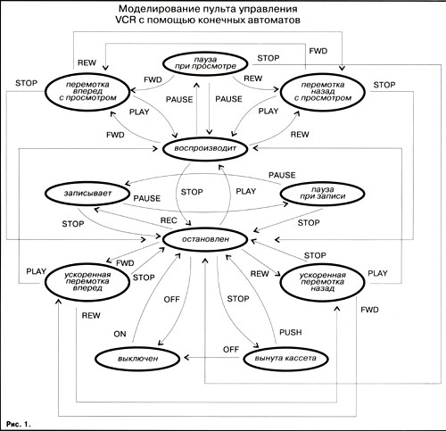 Конечные автоматы (finite state automata) – с ними мы сталкиваемся повсюду: от выключателя освещения до пульта управления видеомагнитофоном. Это такое устройство, подобное обычному реле, которое работает по жесткой, заложенной в него системе правил. Например, находясь в некоем состоянии "р" и встречая символ "а", он переходит в состояние "q" и выдает символ "Ь". Нажали кнопочку – свет зажегся, отжали -погас. Только так и никак иначе. Поскольку число возможных состояний такого автомата конечно, а события (символы) на которые он реагирует, жестко заданы, то и называется он конечным. Работу конечного автомата можно весьма просто представить в графическом виде: каждое состояние обозначим узлом графа, переход из состояния в состояние – ориентированной дугой, а поверх каждой дуги напишем пару из входного и выходного символа. Для примера на рис. 1 представлена работа обычного пульта управления видеомагнитофоном.