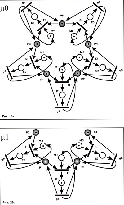 Для полноты картины упомяну вкратце и о такой абстракции, как сети Петри (Petri Nets). Ныне они почти забыты. А ведь это весьма эффективный инструмент для моделирования различных процессов. Сеть Петри чем-то напоминает своеобразное игровое поле, в котором есть лунки (позиции) и задвижки (переходы). В лунках может находиться произвольное число шариков (фишек). Лунки соединяются с задвижками специальными желобками (дугами). При этом желобок не может связывать напрямую лунку с лункой и задвижку с задвижкой. Остается добавить, что при работе учитывается "уклон желобков" (направление дуг). Если во всех входных для данной задвижки лунках есть шарики – она считается "разрешенной". Правила игры (работы сети) очень простые. Произвольным образом выбираем любую "разрешенную" задвижку и открываем ее (переход запускается). При этом из входных лунок у нас исчезает по одному шарику, а в каждой выходной – по одному появляется. Если количество входных и выходных лунок различно, общее количество шариков меняется.