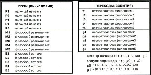 Взгляните на рис. 2. Здесь с помощью обычной сети Петри представлена модель классической задачи Эдгара Дейкстры о пяти обедающих философах. Пять китайских философов уселись по кругу и приготовились к трапезе. Перед каждым из них находится блюдо с нежным рисом, а между блюдами разложено ровно по одной палочке. Итого, у нас пять философов, пять блюд и пять палочек. Чтобы есть рис, философу необходимо ровно две палочки. Немного насытившись, он может положить обе палочки и предаться размышлениям, а затем продолжить свою трапезу.