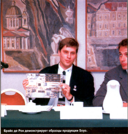 Далее г-н Хоффман коснулся технических аспектов деятельности Soyo Computer lnс.. Компания Soyo была основана в 1985 году и специализировалась на производстве акустических систем, эквалайзеров, радиоприемников. Но уже год спустя, оценив перспективы компьютерной индустрии, компания перешла на выпуск материнских плат. Первой материнской платой, выпущенной в 1986 году была плата для IBM PC XT. С тех пор компания успешно развивалась, сегодня она выпускает широкий спектр продукции как для использования в домашних ПК, так и для крупных промышленных и корпоративных систем. Производственные мощности позволяют выпускать до 250 тыс. плат в месяц. По мере роста компании возникла необходимость в создании региональных отделений для организации сбыта продукции. Сегодня такие отделения работают в США, Голландии, Германии, Корее. В нынешнем году появятся представительства в Австралии, Японии и Сингапуре. В число технических партнеров Soyo входят такие "киты" компьютерного бизнеса, как Adaptec, Apple, Creative, Diamond, Motorola.