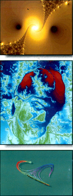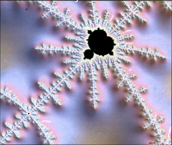 Фрактальная геометрия Мандельброта бросила еще один вызов геометрии Евклида. Фракталы – это множества дробной размерности (не одномерные, не двумерные); это нечто промежуточное между точкой и линией, линией и поверхностью, поверхностью и телом. Множество Мандельброта (один из примеров фракталов) на плоскости математически определяется очень просто – это множество всех таких комплексных "с", при которых итерационная последовательность z -> z2 + с (начиная с z = О, с = х + iy) остается ограниченной, не уходя на бесконечность. При графической интерпретации цвет точки на плоскости (х,у) может определяться, скажем, номером итерации. Что в результате может получиться, можно увидеть на картинке с изображением фрактала Мандельброта. Здесь приводятся и другие иллюстрации, также полученные с помощью фракталов. Фракталы – это не просто математические абстракции, которые в силу своей красоты и изящества завораживают многих людей, причем даже тех, кто весьма далек от науки. Они дают качественно новое представление об окружающей нас природе. Это очень мощный инструмент для изучения хаоса. И в них, как в капельке росы, отражается наш реальный и придуманный мир – мир самоподобия.