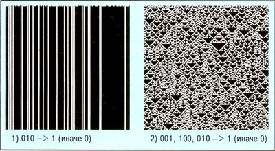 Игра "Жизнь" представляет собой частный случай клеточного автомата. Здесь он работает в двумерном пространстве (2D), с радиусом 1 (1R – рассматриваются только соседи на расстоянии 1 клетки), с числом состояний клетки, равным 2 (2S – пустая или с крестиком). Да и глубина памяти (предыдущие состояния) в точности равна 1 (1М -мы рассматривали состояние только одного предшествующего поколения). Клеточные автоматы, оказывается, могут быть даже одномерными (1D). Простейшим клеточным автоматом называется автомат со следующими характеристиками: 1D, 1R, 2S, 1М. Состояние каждой клетки здесь зависит от ее предыдущего состояния и состояния двух ее соседей. Рассмотрим два разных правила: