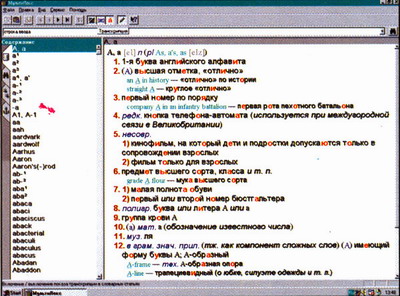 Как уже говорилось, "МультиЛекс" – словарь морфологический, и ему достаточно хранить основы слов и ссылки на конкретные словарные статьи. Ссылки расставлены и внутри словарного массива – в полном соответствии с оригинальными "см.", а гипертекст позволяет расширить тематическую область поиска точного перевода. Кстати, помимо поиска статей система автоматически ищет все словосочетания с введенным словом и выводит их отдельным списком.